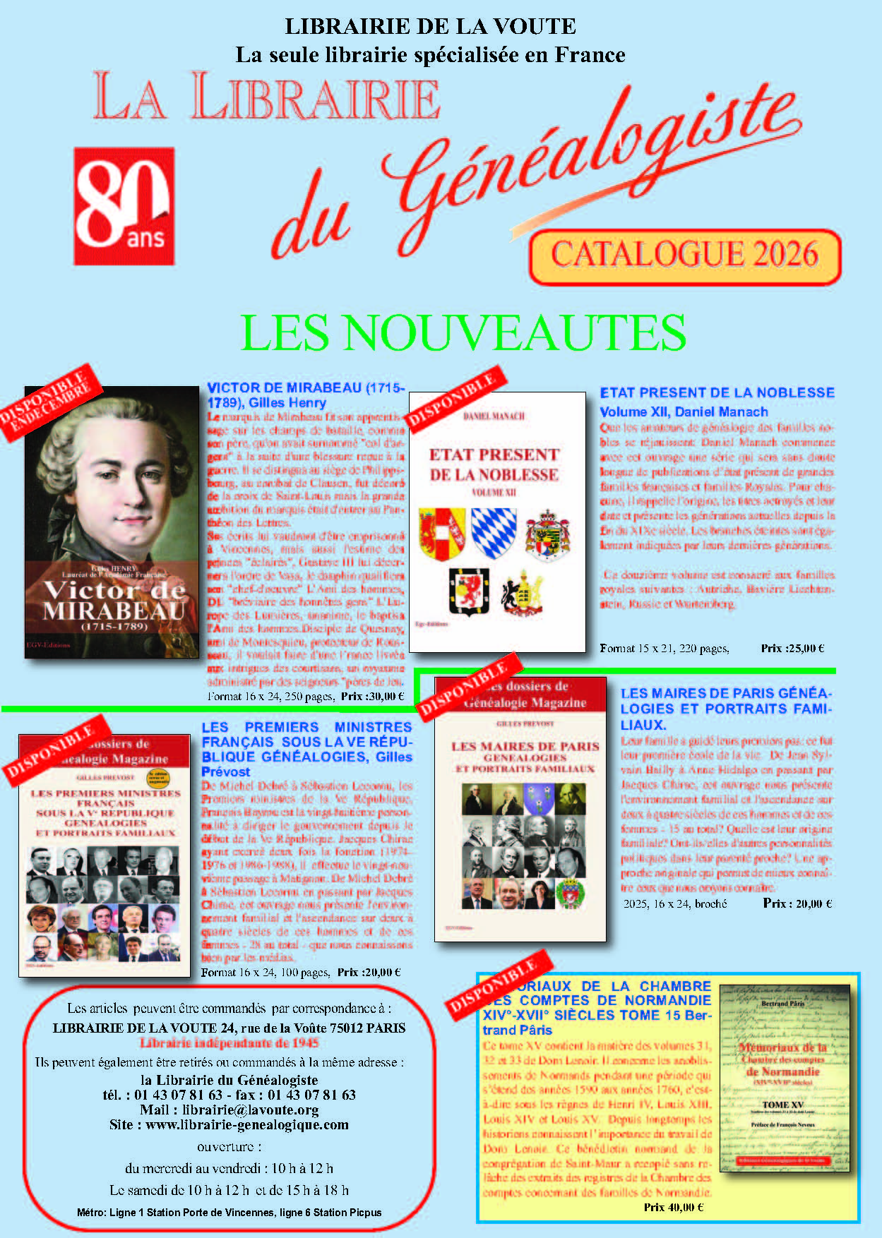 Catalogue généalogique 2026  Vous trouverez dans ce catalogue: 26 modèles différents d’arbres généalogiques à remplir, une sélection de 935 d’ouvrages qui vous aiderons dans vos recherches, développeront vos connaissances et resteront longtemps dans votre bibliothèques, des cd-roms, notre revue. Pour tout achat d’un montant de 75 € (hors frais d’expédition), un cadeau sera joint à l’envoi.Et…
